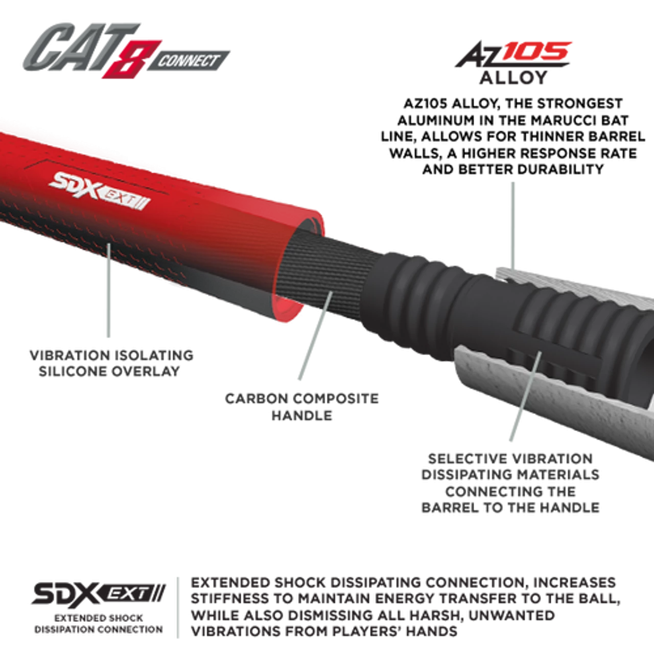 Power hitters love the end-loaded feel and ultra-responsive barrel of the CAT8 Connect BBCOR, a two-piece hybrid bat featuring a power-loaded barrel built with AZ105 super-strength aluminum alloy. The patent-pending SDX EXT connection increases stiffness to maintain energy transfer to the ball, while also dismissing negative vibrations to the hands, resulting in maximum power and minimum sting.