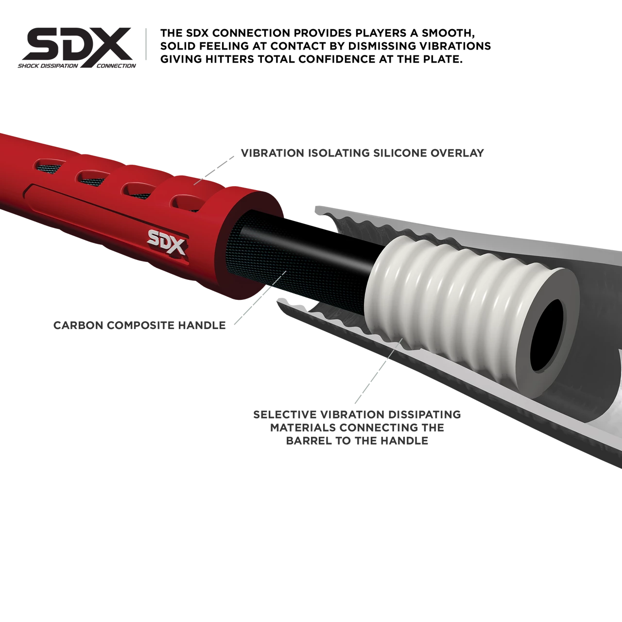 - Carbon composite handle and MDX composite barrel connect by SDX EXT to dismiss harsh, unwanted vibrations from players’ hands