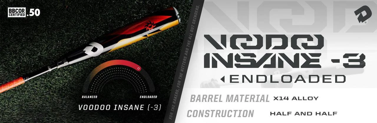 The 2018 Voodoo Insane BBCOR bat is the end-loaded bat in our lineup, re-designed for 2018 with an extended sweet spot and stiffer handle. It has a slightly different sound and feel from past models, but the same exceptional performance in a bat that’s preferred by many elite high school and college level hitters.